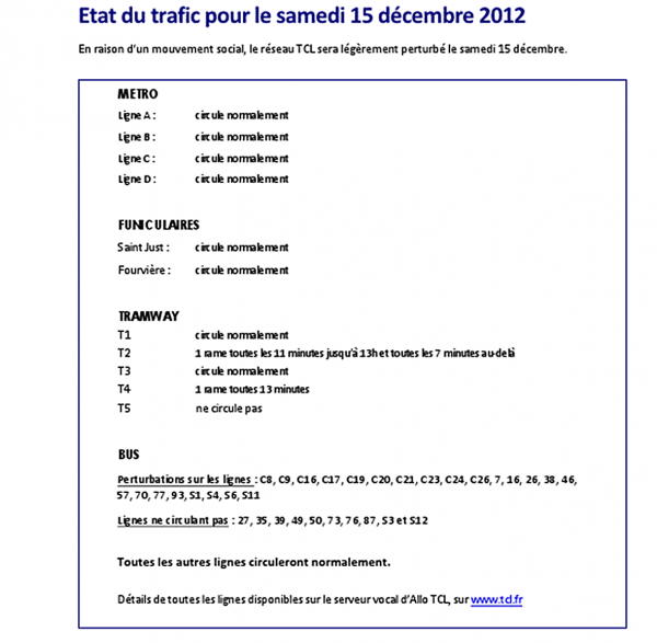 Communiqué officiel  –  Etat du trafic pour le samedi 15 décembre 2012